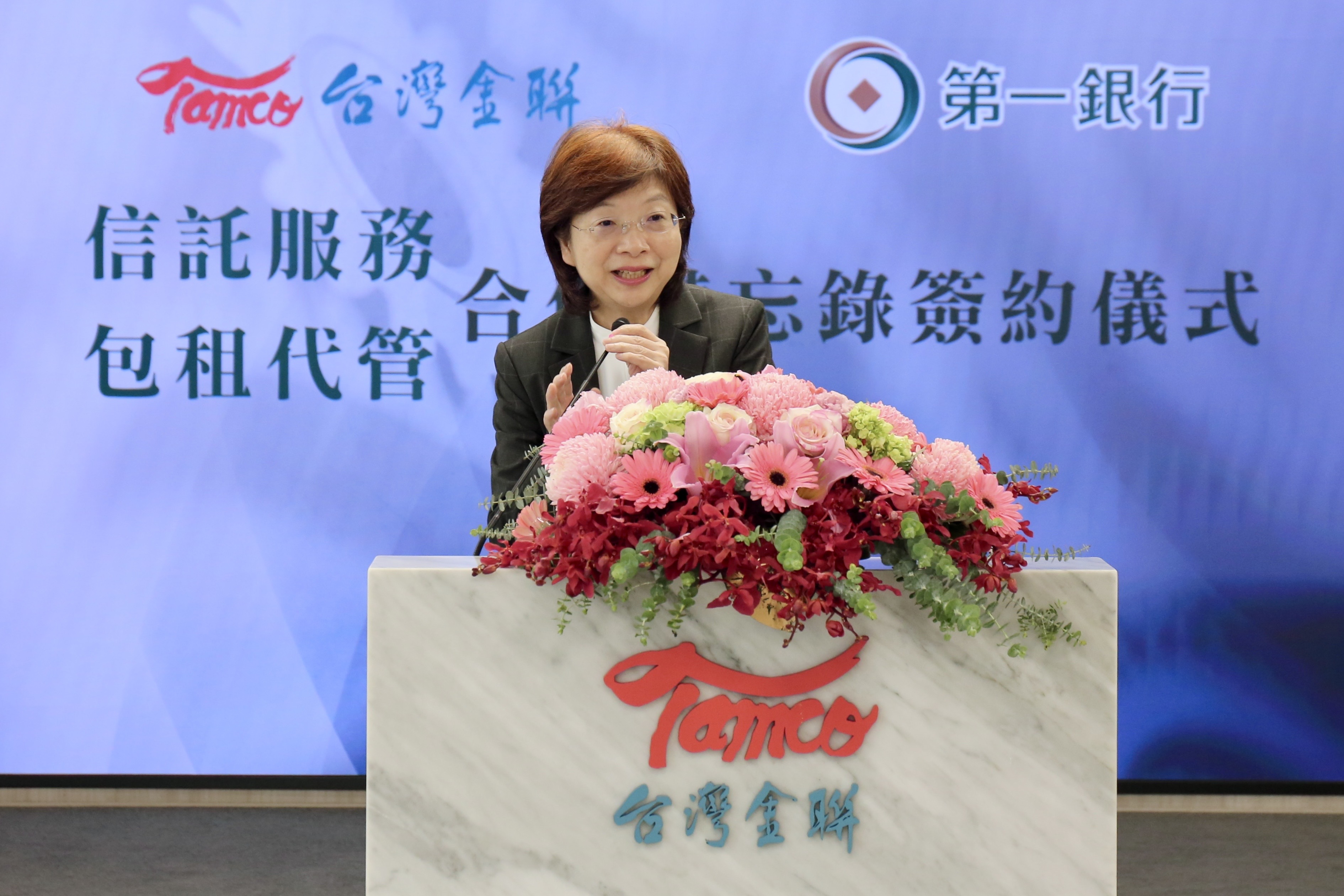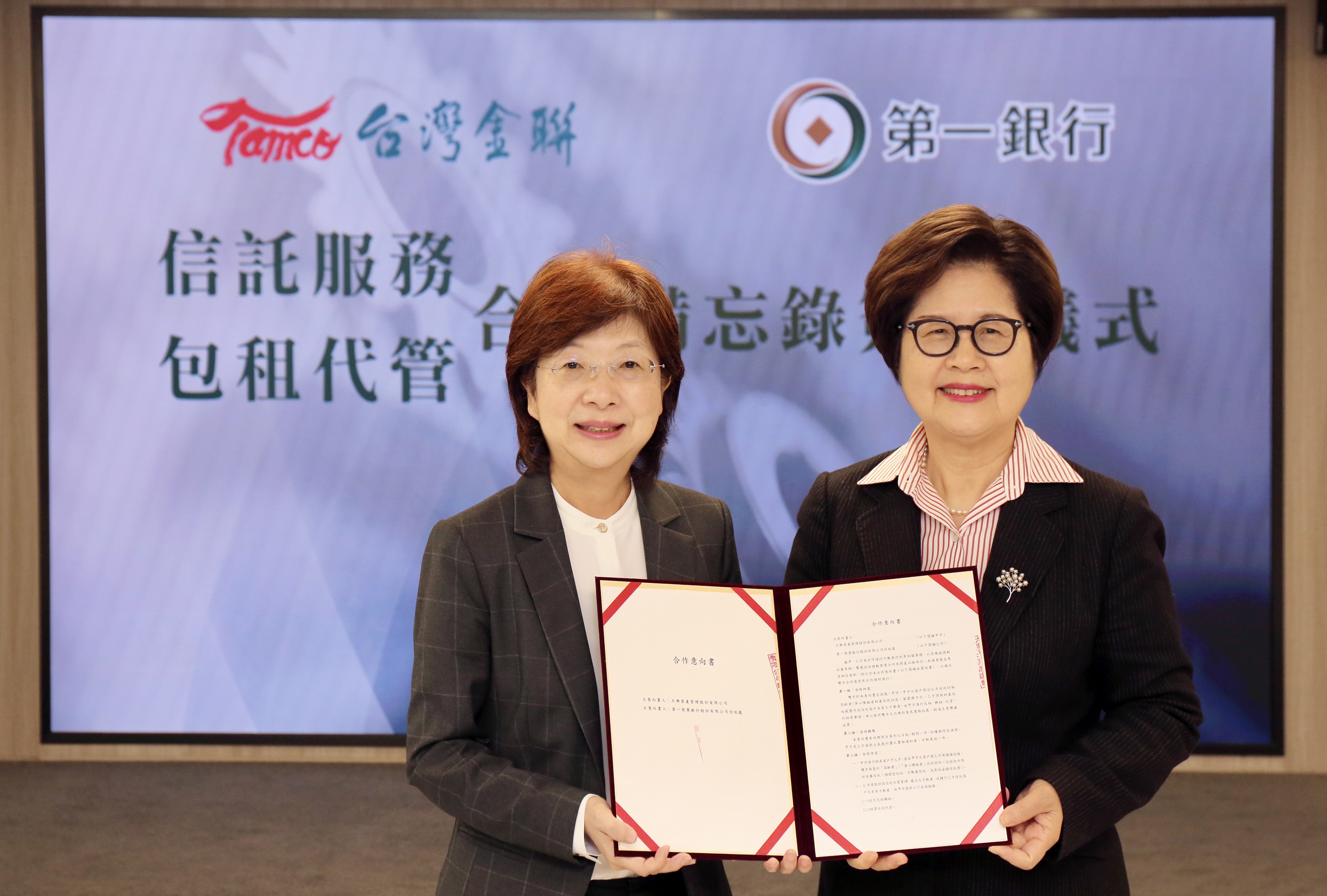 25日簽署儀式是由台灣金聯公司董事長宮文萍與第一銀行董事長邱月琴共同簽署。宮文萍在致詞中強調,台灣金聯公司由公股銀行持有82.59%股權,所有公股銀行都是重要的股東,透過包租代管業務結合股東銀行業務優勢力量,例如安養信託、不動產信託或金錢信託等,展開公公合作、強強聯手,建構一道綿密的服務網絡生態圈,目前正在逐漸成形中,與第一銀行簽署合作是整個計畫的一環,短期內還會有更多公股銀行加入,民營銀行亦可在邀請之列,請外界拭目以待。